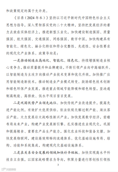 《目录(2024年本)》坚持以习近平新时代中国特色社会主义思想为指导,深入贯彻党的二十大精神,落实中央财经委第一次会议部署,坚持把发展经济的着力点放在实体经济上,推进新型工业化,加快建设制造强国、质量强国、航天强国、交通强国、网络强国、数字中国,加快构建具有智能化、绿色化、融合化特征和符合完整性、先进性、安全性要求的现代化产业体系。政策导向是:
