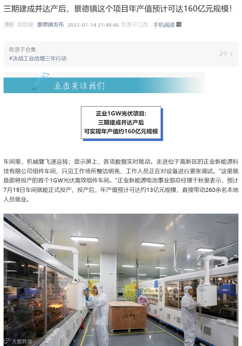 决战工业倍增三年行动——正业光伏项目三期建成投产后年营收将达160亿元。“景德镇发布”专题报道合盛公司-正业1GW光伏项目。