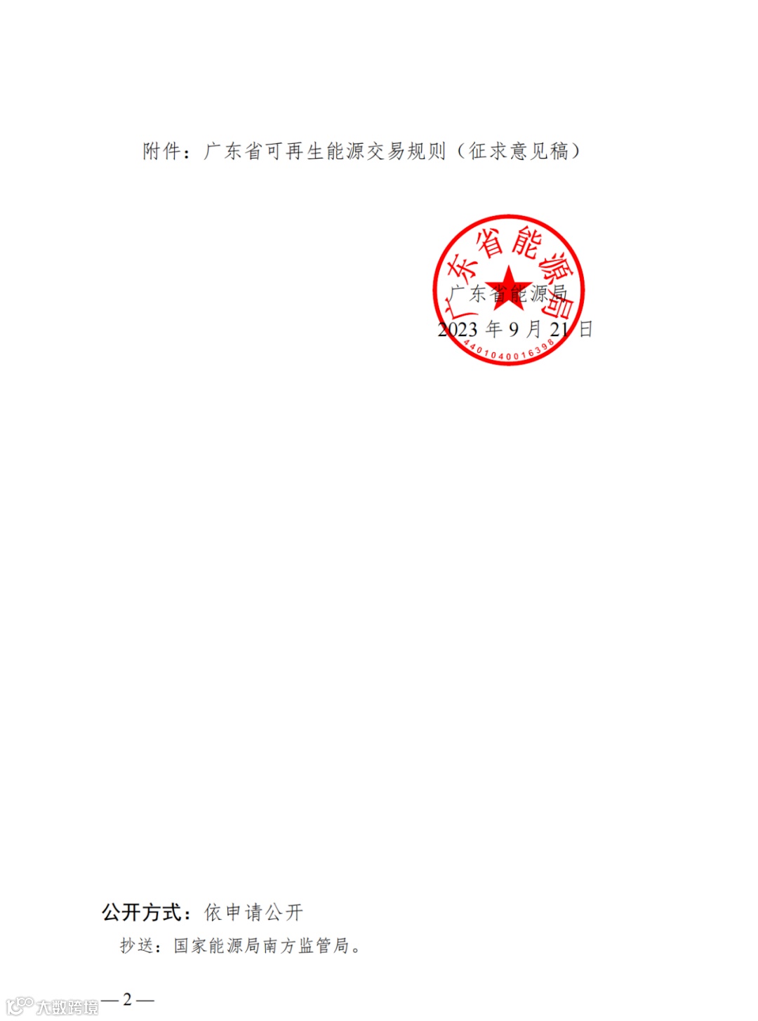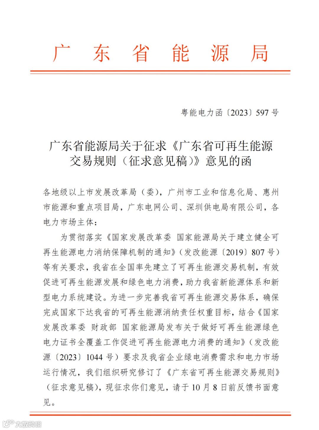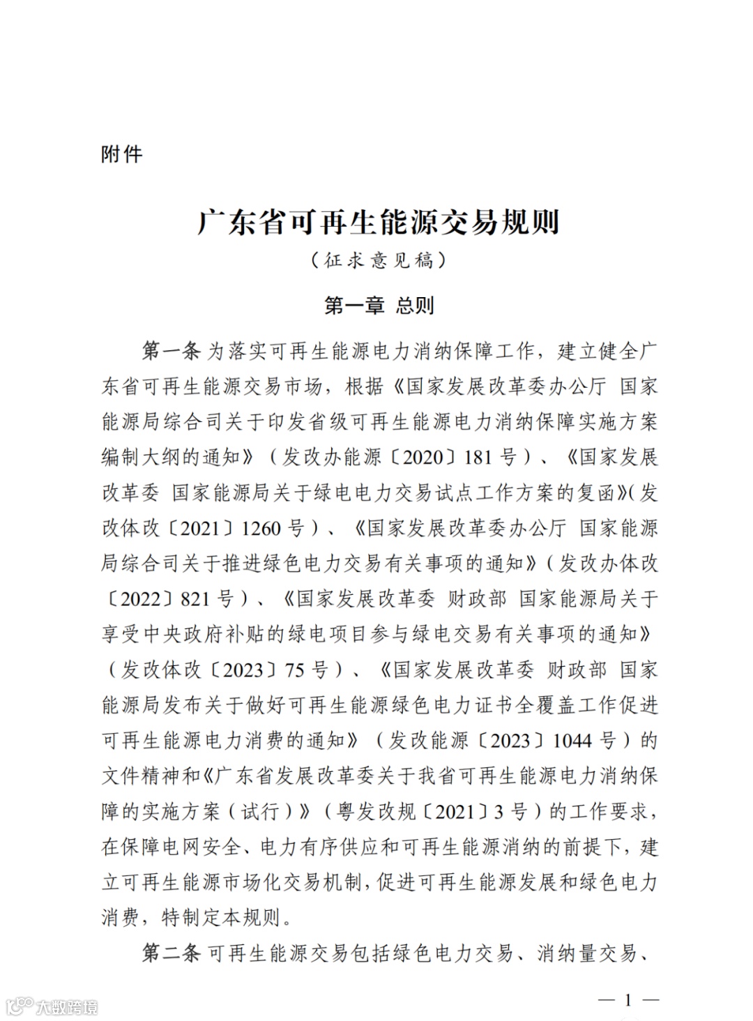 9月21日,广东省能源局就《广东省可再生能源交易规则(征求意见稿)》公开征求意见。