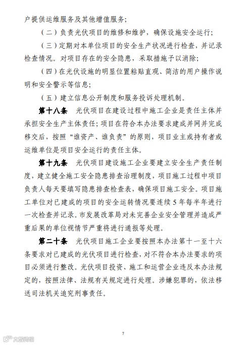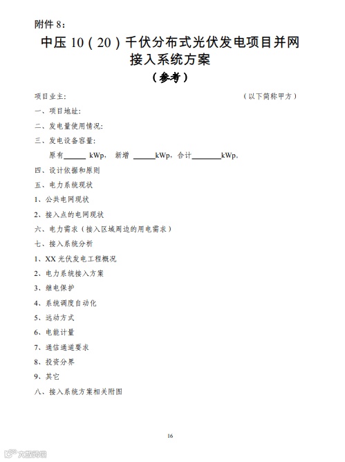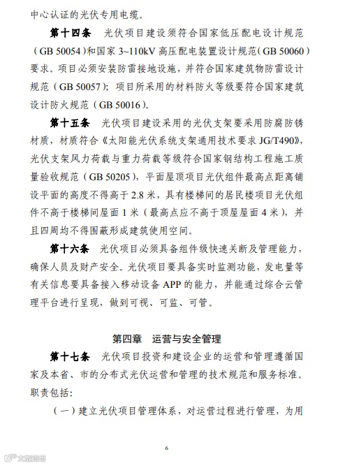 在通知中特别提出:光伏项目建设采用的光伏支架要采用防腐防锈材质,材质符合《太阳能光伏系统支架通用技术要求 JG/T490》,光伏支架风力荷载与重力荷载等级符合国家钢结构工程施工质量验收规范(GB 50205),平面屋顶项目光伏组件最高点距离铺设平面的高度不得高于 2.8 米,具有楼梯间的居民楼项目光伏组件不高于楼梯间屋面 1 米(最高点应不高于顶屋屋面 4 米),并且四周均不得围蔽形成建筑使用空间。