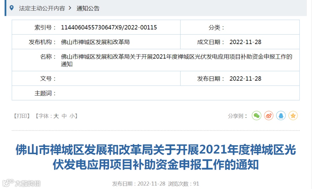 佛山市禅城区发展和改革局关于开展2021年度禅城区光伏发电应用项目补助资金申报工作的通知