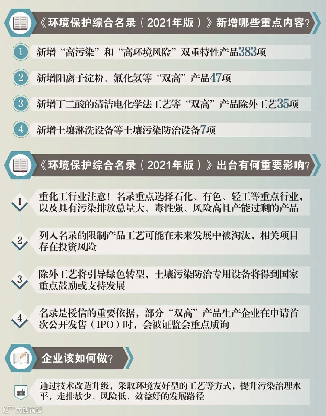 对此,上述负责人公开表示,《名录(2021版)》中,将石油焦等11项生产过程中大气污染物排放量大的产品,阳离子淀粉等13项生产过程中水污染物排放量大的产品,涉铬彩涂板等7项对土壤环境有明显影响的产品纳入,便于财政、税务、海关等部门精准识别、有效应用,形成政策合力。