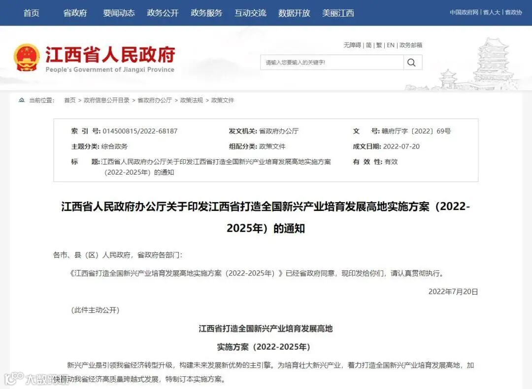 近日,江西省人民政府办公厅印发了《江西省打造全国新兴产业培育发展高地实施方案(2022-2025年)的通知》(以下简称《通知》),提出到2025年底,全省新兴产业综合实力稳步增强,产业结构层次明显提高,优势型产业若干领域达到国内领先水平,成长型产业加速发展,未来产业初步布局,形成新兴产业健康发展、协调推进的基本格局,成为全国新兴产业培育发展高地。