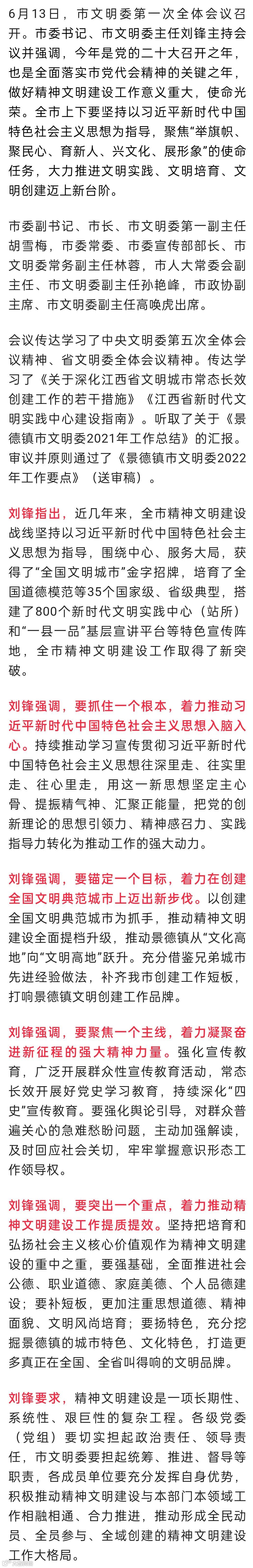 刘锋在市文明委第一次全体会议上强调