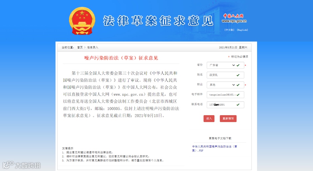 现将《中华人民共和国噪声污染防治法(草案)》在中国人大网公布,即日起社会公众可以直接登录中国人大网(www.npc.gov.cn)提出意见,也可以将意见寄送全国人大常委会法制工作委员会(北京市西城区前门西大街1号,邮编:100805。信封上请注明噪声污染防治法草案征求意见)。