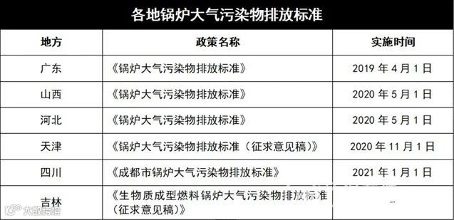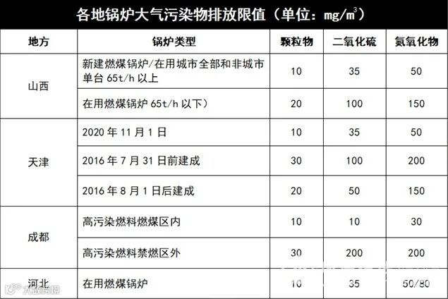 锅炉大气污染物排放颗粒物不得高于30mg/m³(燃煤和燃油)、20mg/m³(燃气);二氧化硫不得高于200mg/m³(燃煤)、100mg/m³(燃油)、50mg/m³(燃气);氮氧化物排放不高于200mg/m³(燃煤和燃油)、150mg/m³(燃气)。