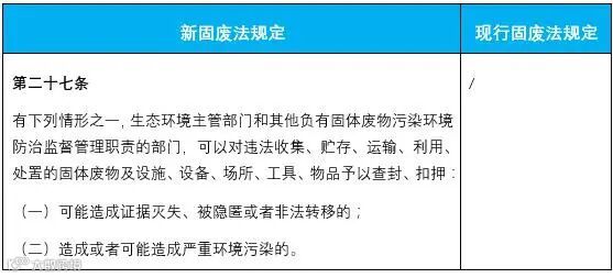 4.明确了对违法收集、贮存、运输、利用、处置的固体废物及设施、设备、场所、工具、物品予以查封、扣押的规定