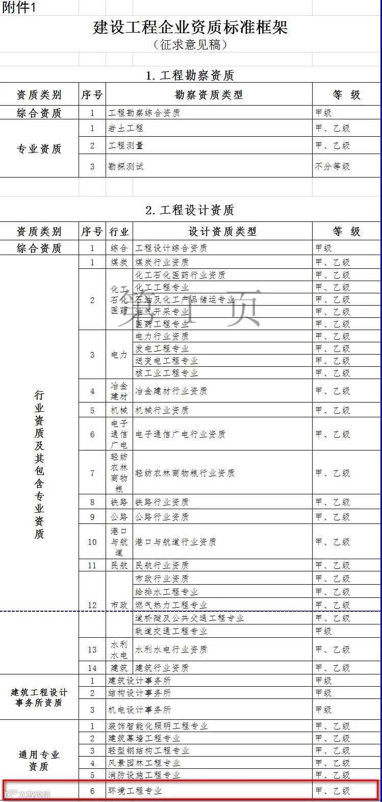 日前,住房和城乡建设部官网发布《建设工程企业资质标准框架(征求意见稿)》,拟大幅压减企业资质类别和等级。环境工程专项合并水污染防治工程、大气污染防治工程、固体处理处置工程、物理污染防治工程、污染修复工程5个分项,整合为环境工程专业资质,资质等级压减为甲、乙两级,原丙级资质并入相应专业乙级资质。保留3类事务所资质。