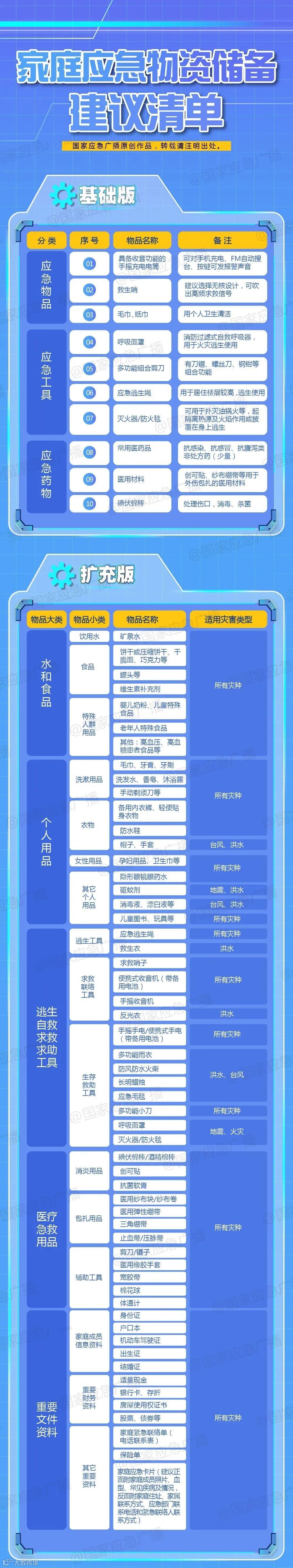 全国家庭应急物资储备建议清单