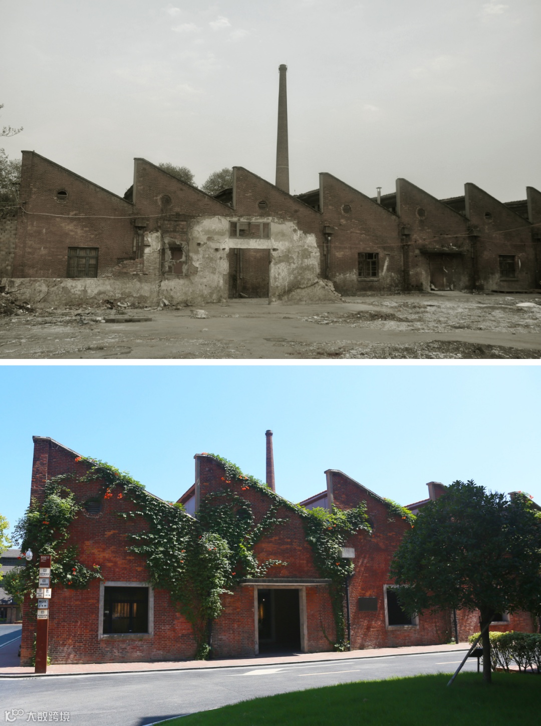 拼版图片。上图为改造前的景德镇原国营宇宙瓷厂旧址,下图为今陶溪川文创街区一角。