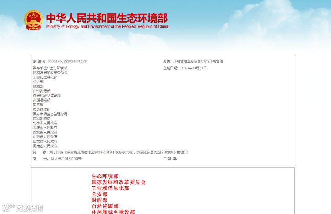 关于印发《京津冀及周边地区2018-2019年秋冬季大气污染综合治理攻坚行动方案》的通知