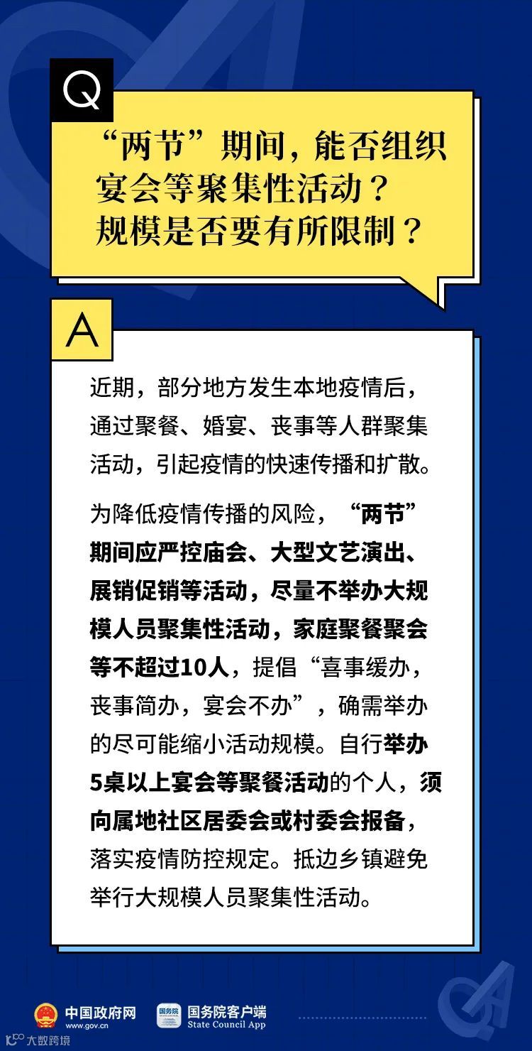(一)严格控制聚集性活动。按照非必要不举办的原则,严控庙会、大型文艺演出、展销促销等活动,减少农村集市规模和频次,控制人流量,落实通风消毒等防控措施。举办会议、聚会等活动应当控制人数,尽量举办线上会议或视频会议,50人以上活动应制定防控方案,严格落实各项防控措施。弘扬节约风尚,尽量不举办大规模人员聚集性活动,提倡家庭聚餐聚会等不超过10人,提倡“喜事缓办,丧事简办,宴会不办”,确需举办的尽可能缩小活动规模。承办5桌以上宴会等聚餐活动的餐饮单位须严格做好疫情防控工作,确保就餐人员落实扫码、现场测温和佩戴口罩等措施后进入就餐场所,做好餐厅的通风消毒工作;自行举办5桌以上宴会等聚餐活动的个人,须向属地社区居委会或村委会报备,落实属地疫情防控规定。抵边乡镇避免举行大规模人员聚集性活动。