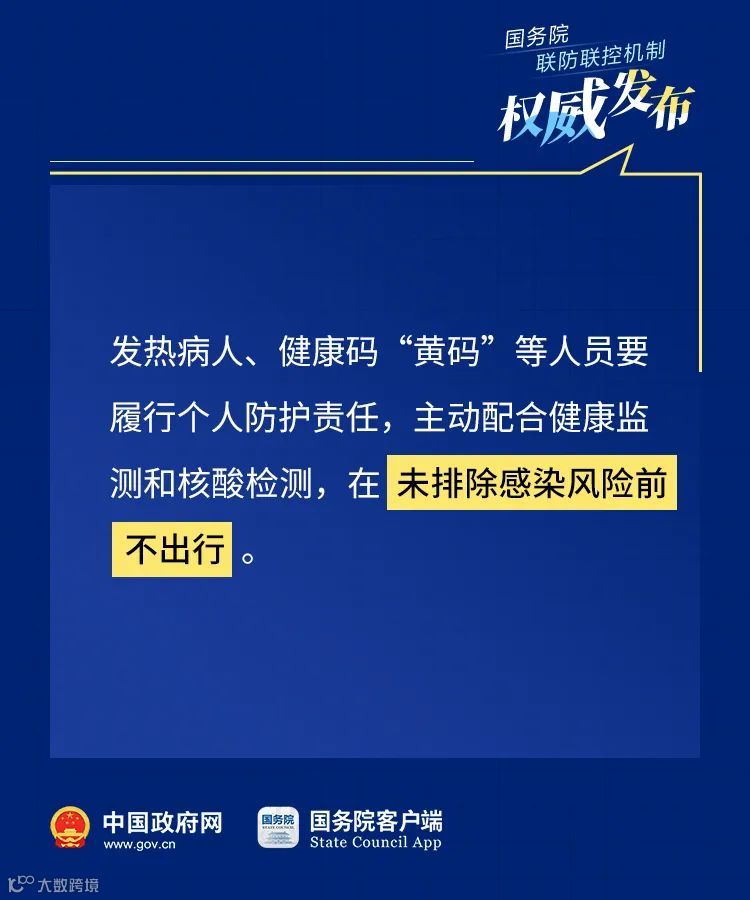 6.发热病人、健康码“黄码”等人员要履行个人防护责任,主动配合健康监测和核酸检测,在未排除感染风险前不出行。