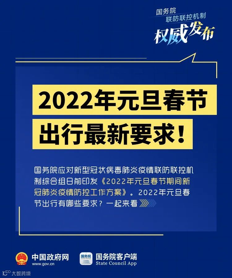 为做好2022年元旦春节期间疫情防控工作,国务院应对新型冠状病毒肺炎疫情联防联控机制综合组制定了《2022年元旦春节期间新冠肺炎疫情防控工作方案》。经国务院应对新型冠状病毒肺炎疫情联防联控机制同意,现印发给你们,请认真组织实施。