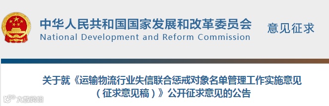 国家发展改革委会同有关部门研究起草了《关于加强和规范运输物流行业失信联合惩戒对象名单管理工作的实施意见(征求意见稿)》。