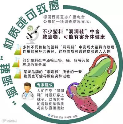 2.德国媒体:洞洞鞋或致癌,就在人们对洞洞鞋的钟爱有增无减之时,德国媒体突爆猛料:研究人员在多种不同价位的塑料洞洞鞋中发现大量具有致癌作用的多环芳香烃,这些物质可通过皮肤进入人体。另外,部分洞洞鞋中还检出铬、镉、铅等污染环境的重金属,可能有害身体健康。