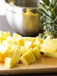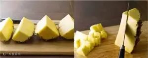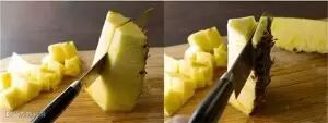 Step 1 : 菠萝(凤梨)去头去尾,立在砧板上,然后打竖对半切开
