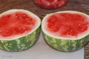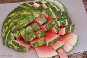 Step 2 : 将西瓜横切面朝下放,然后纵向切段,距离约 1 英寸