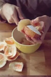 Step 3 : 根据果衣的间距来切出成瓣的果肉(这一步最好在碗上进行,切好后可以直接掉入碗內,还可以保存滴下的果汁)