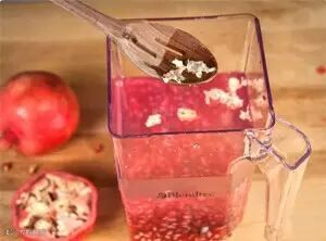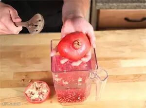 Step 2 : 橫切面朝着裝了水的容器用勺子用力拍打石榴,让果肉掉进水里