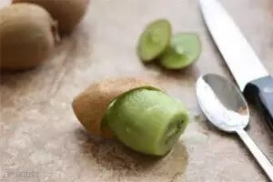 Step 2 :勺子插入奇异果,尽可能貼着果皮,然后旋转起肉即可。
