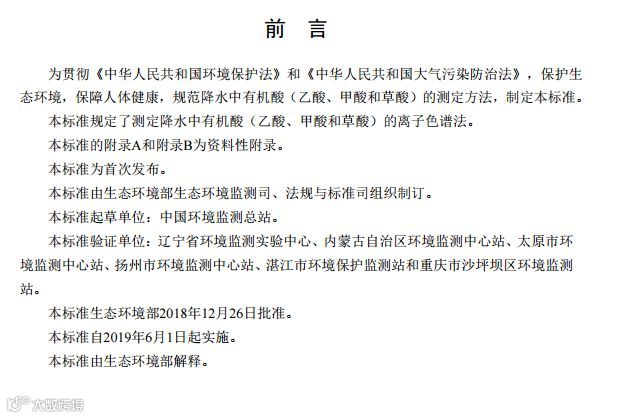 为贯彻《中华人民共和国环境保护法》,保护生态环境,保障人体健康,规范生态环境监测工作,现批准《环境空气 降水中有机酸(乙酸、甲酸和草酸)的测定 离子色谱法》等五项标准为国家环境保护标准,并予发布。
