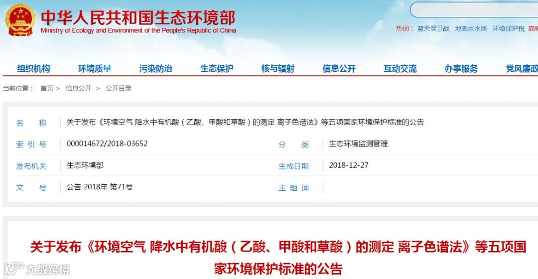 关于发布《环境空气 降水中有机酸(乙酸、甲酸和草酸)的测定 离子色谱法》等五项国家环境保护标准的公告