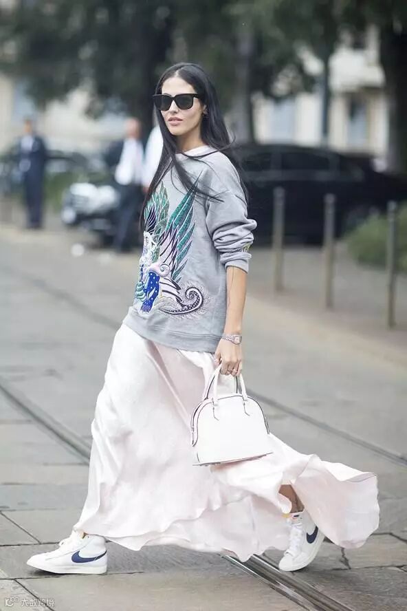 优雅长裙和运动风也有交集了!这样穿着去参加PARTY、晚会,既不耽搁赶路,又不怕当晚没有回头率了!