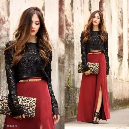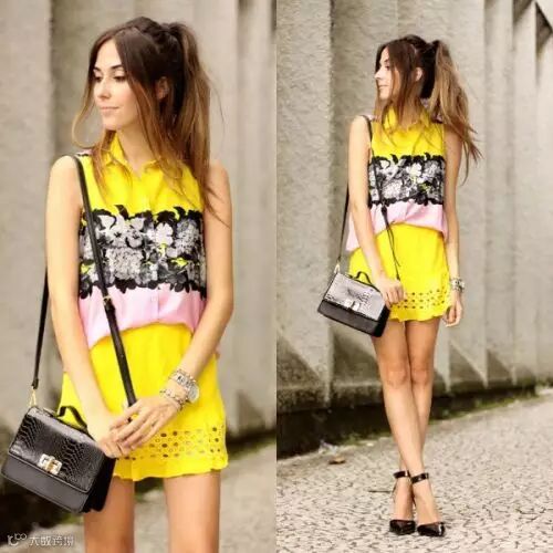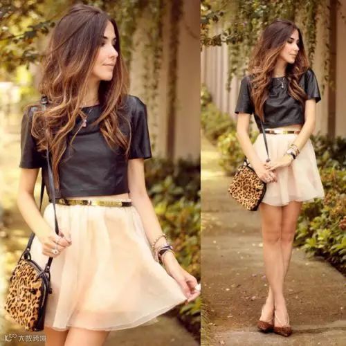 包包的颜色,鞋子的颜色还有腰带的颜色想呼应!金色腰带也在视觉上让裙子更有质感!上衣的长度如果比这样还短,其他不变的话,身体就分截了!