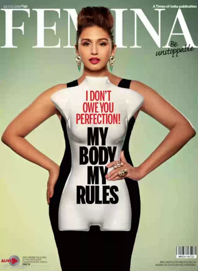 这是一本印度杂志,封面上身材并不苗条完美也没有修图的印度女星散发着独特的自信和魅力,她手上拿着的模特印着的字是「我的身体我自己做主,我不需要为你变得完美。」