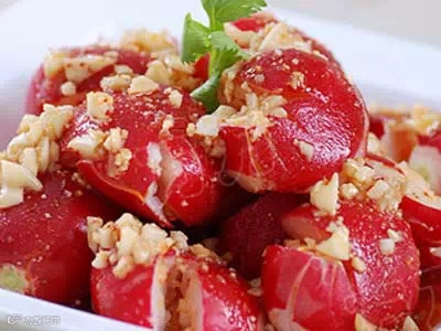 用料:樱桃萝卜300克,蒜5瓣,酱油2勺,醋4勺,食盐1/2勺,白糖1/2勺,辣椒油1勺,花生粉1勺