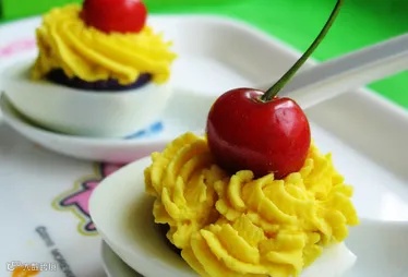 8.蛋黄泥用裱花袋在紫薯上挤出花,然后放上一颗樱桃点缀。