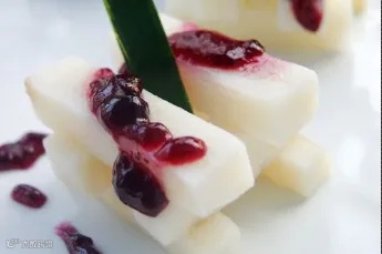 5.蓝莓酱略加些水稀释,淋在山药条上即可食用。