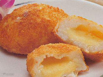 2,土豆、咸蛋黄蒸熟,土豆趁热去皮捣碎,加入鸡、蛋牛奶、糯米粉,拌匀,分成40克左右的剂子,包入蛋黄碎,拍成饼状,两面沾面包碎。入锅炸至金黄,出锅即成
