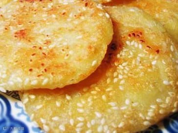 2、撮成小团在手里压成饼,粘上白芝麻(也有没有粘的~)入平底锅里一点点油小火慢慢煎得两面金黄就OK了