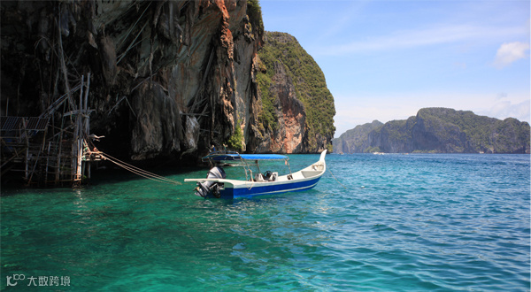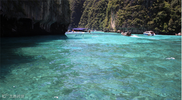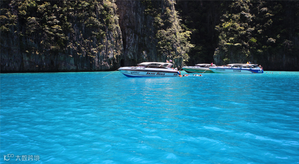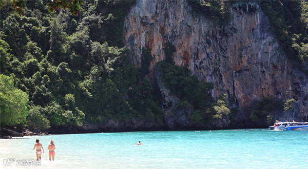 第二天清晨,安静的街道与夜晚相比少了几分喧闹,空气也充满了闲适和浪漫的气氛,鸟儿在树上自娱自乐地唱歌,猫儿在路旁打着盹儿。走在松软的沙滩上,感受脚丫被细沙温柔抚摸的感觉,有种说不出的舒服。循着烤面包的香味,傻子都能找到一家小店,吃一顿美味的早餐。酒足饭饱之后,便向传说中的玛雅湾挺进——莱昂纳多-迪卡普里奥主演的电影《海滩》就是在这里取景的。电影里的椰子树和房屋都是另外搭建的,但湛蓝的海水和影片中一样清澈,透过强烈阳光可以看见水底悠游的鱼儿。因为三面都是悬崖,这里成了丝毫不受尘世污染的世外桃源。举起相机随便按下快门,任何一张照片都可以当风光明信片。
