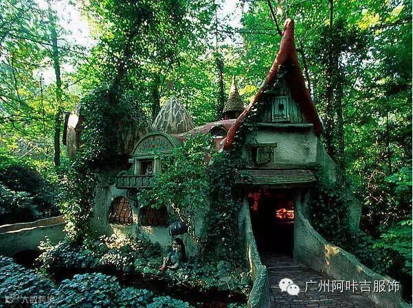 荷兰Efteling的森林小屋,真的就是建造在树林里,屋主种植蕨类,并且让它攀爬在房子上,营造出森林的感觉。