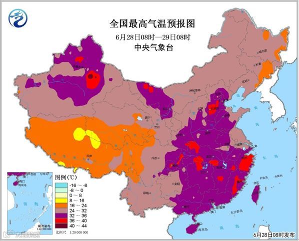 6月28日白天,河北中南部、北京、天津南部、湖北西部和南部、重庆以及江南大部、华南中东部等地日最高气温有35~36℃,局地可达37~39℃。
