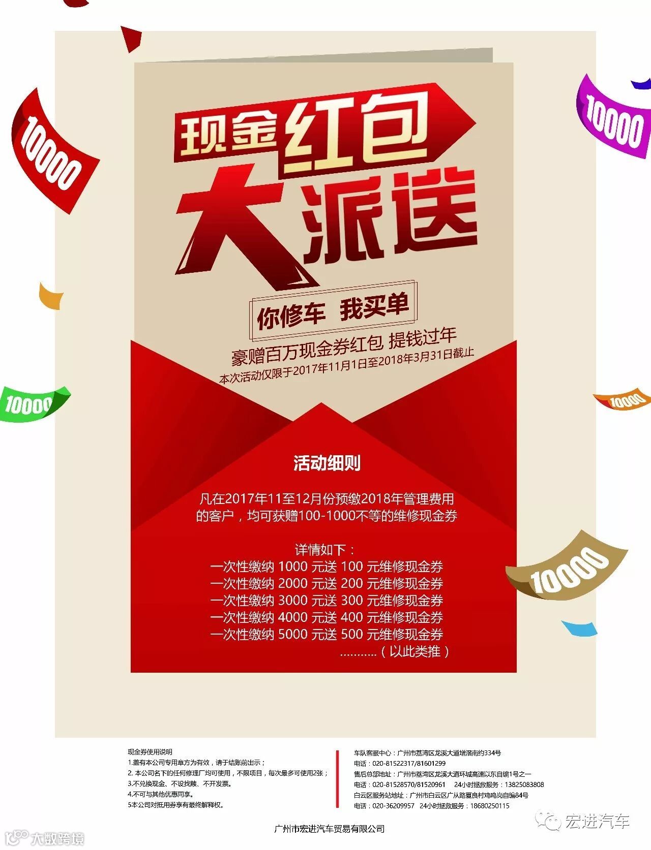 快讯二:目前车队正在火热进行每年一度的优惠赠送活动,凡提前缴纳2018年 费用的客户,,均可获赠100-1000不等的维修抵用券,详情可直接到车队前台了解或致电:81601299、81522317.81414289、81413030咨询。请各位司机朋友不要错过这次机会。