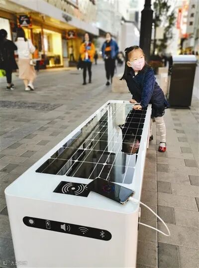 天津金街滨江道有这样几张座椅,光洁的表面嵌满了太阳能光伏电池组,侧面留出了几个热插拔端口,游客逛金街手机没电了可以在这里坐会儿,免费给手机充电。