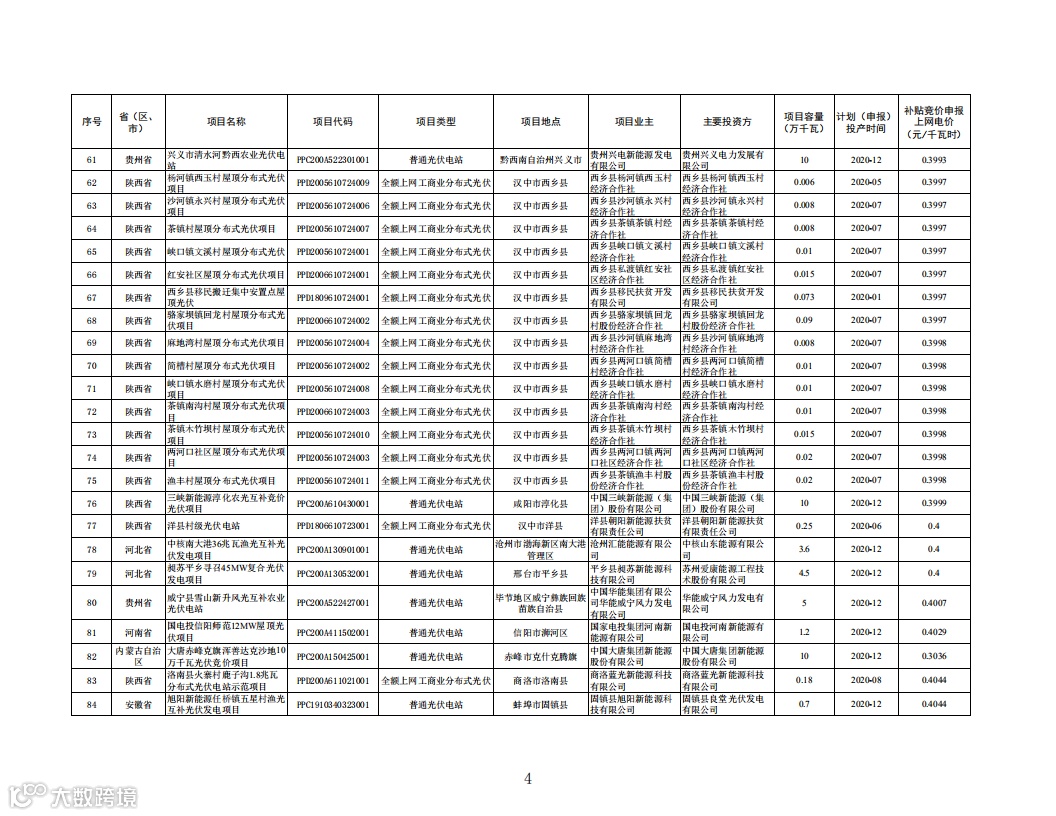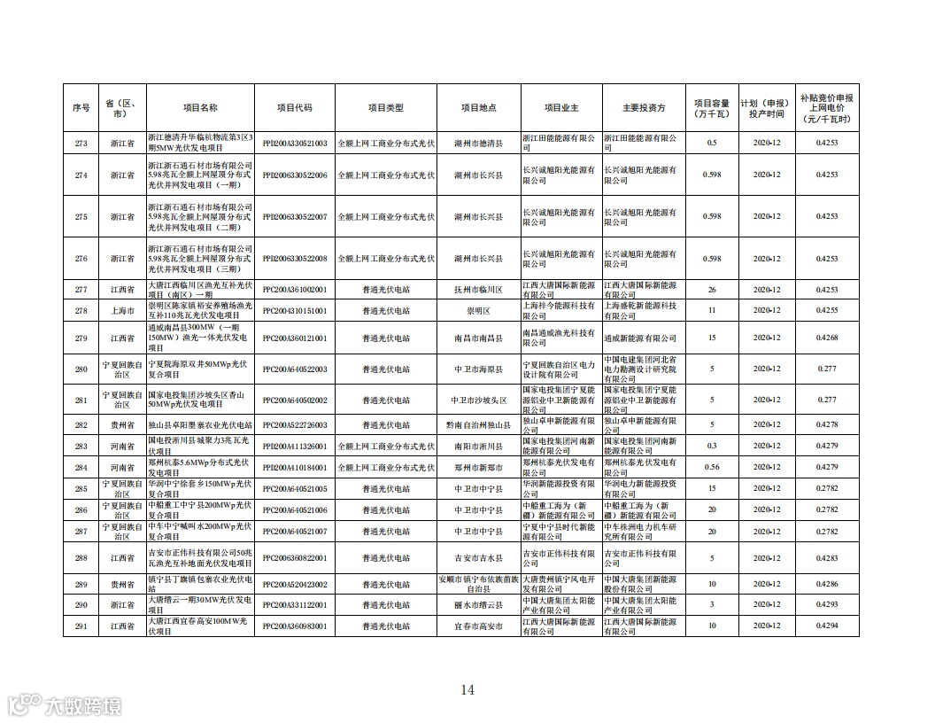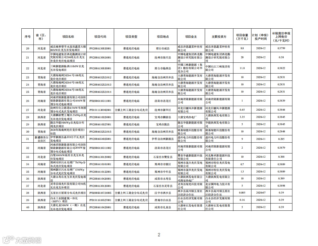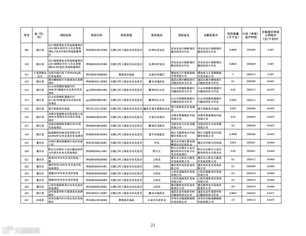 从项目电价看,单个项目最低电价为0.2427元/千瓦时(相比2019年的0.2795元/千瓦时降低0.0368元/千瓦时),加权平均电价为0.3720元/千瓦时(相比2019年的0.4364元/千瓦时降低0.0644元/千瓦时),其中普通光伏电站及全额上网分布式项目平均电价为0.3720元/千瓦时,自发自用、余电上网分布式项目平均电价为0.2895元/千瓦时。