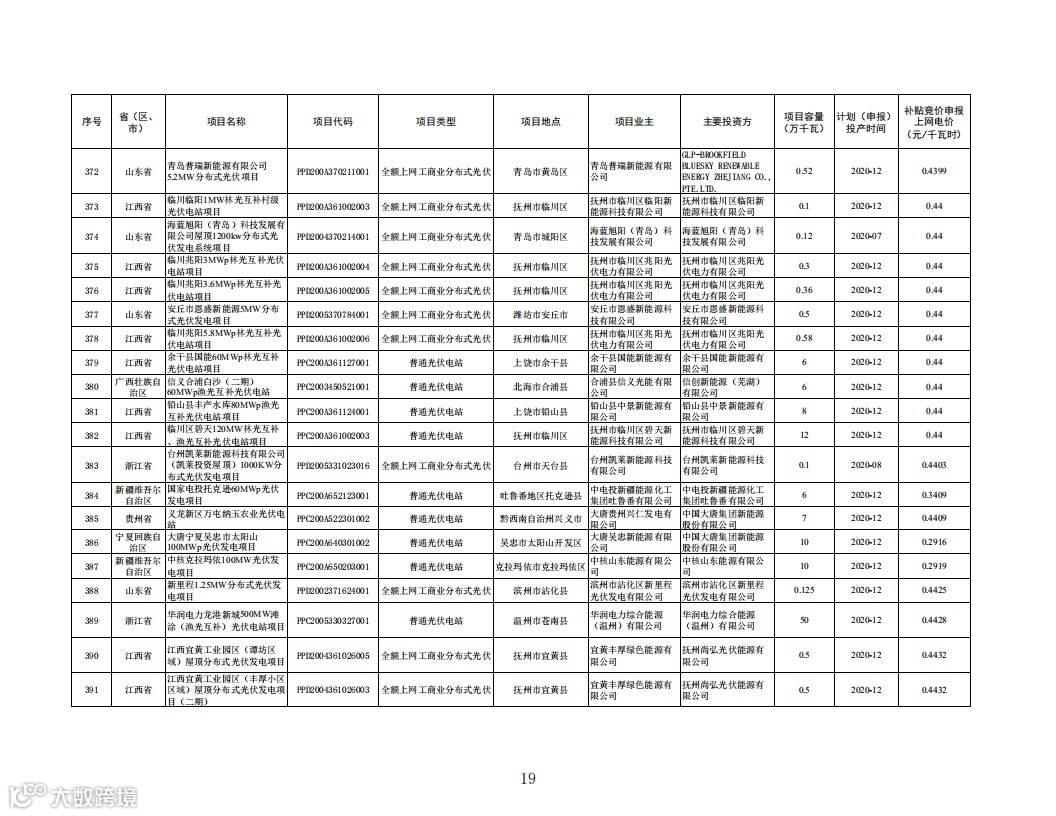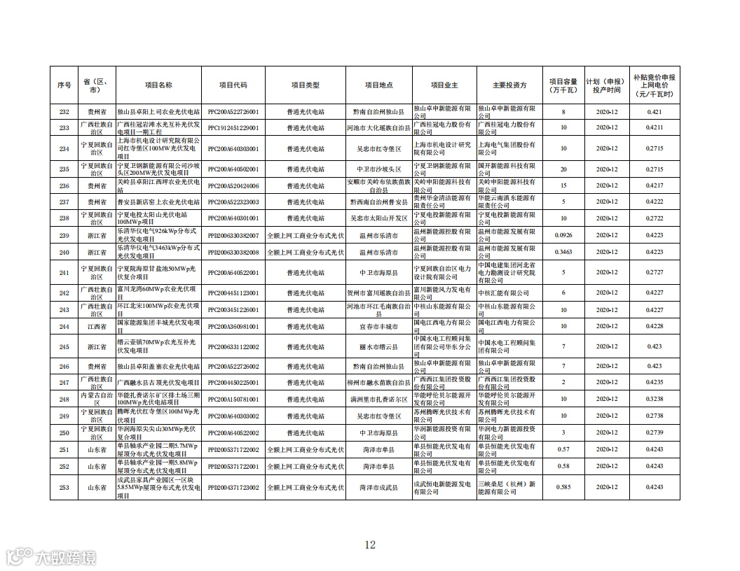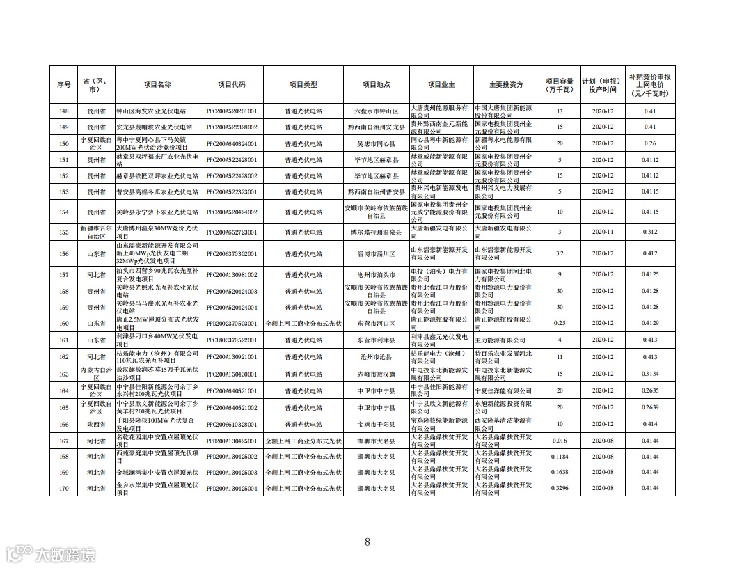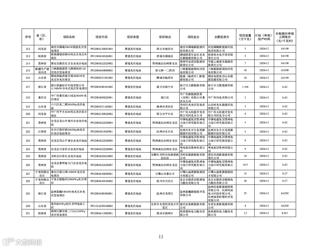 从项目电价看,单个项目最低电价为0.2427元/千瓦时(相比2019年的0.2795元/千瓦时降低0.0368元/千瓦时),加权平均电价为0.3720元/千瓦时(相比2019年的0.4364元/千瓦时降低0.0644元/千瓦时),其中普通光伏电站及全额上网分布式项目平均电价为0.3720元/千瓦时,自发自用、余电上网分布式项目平均电价为0.2895元/千瓦时。