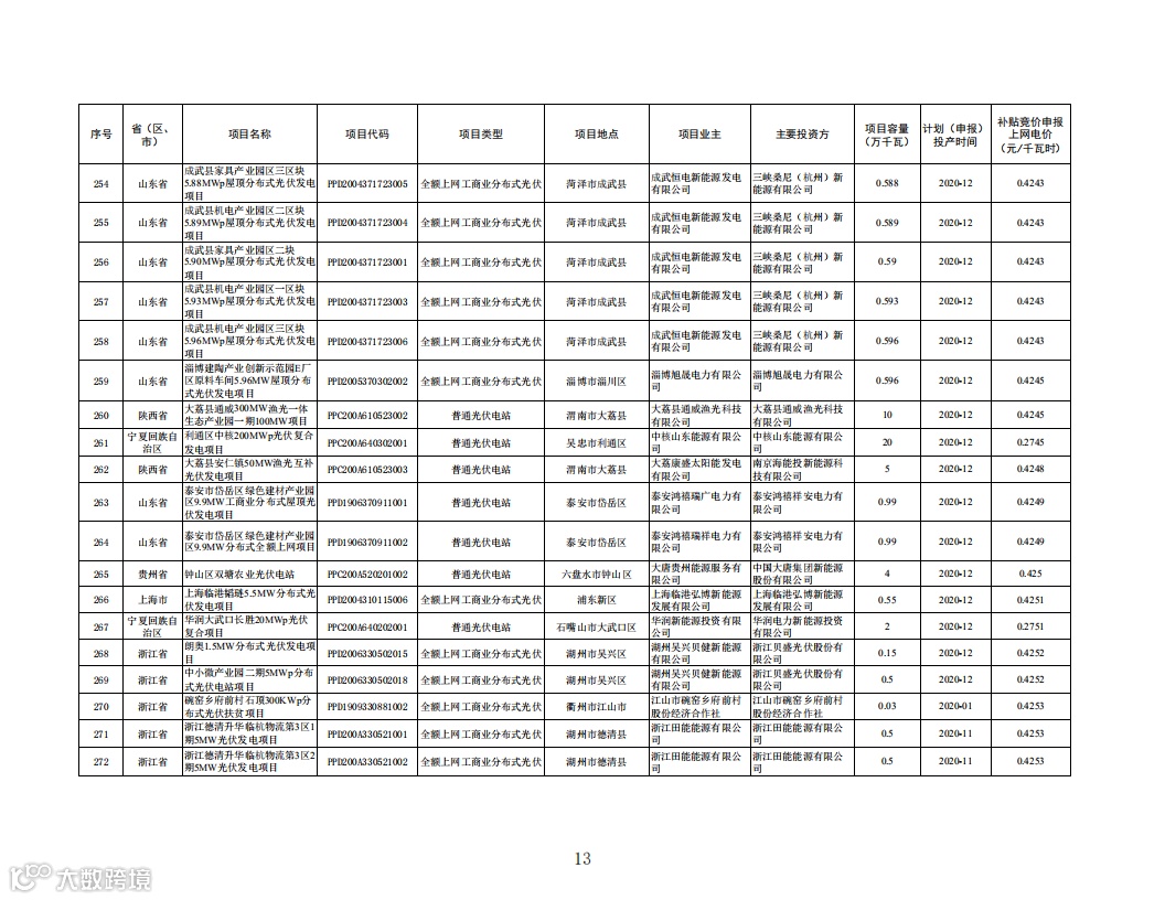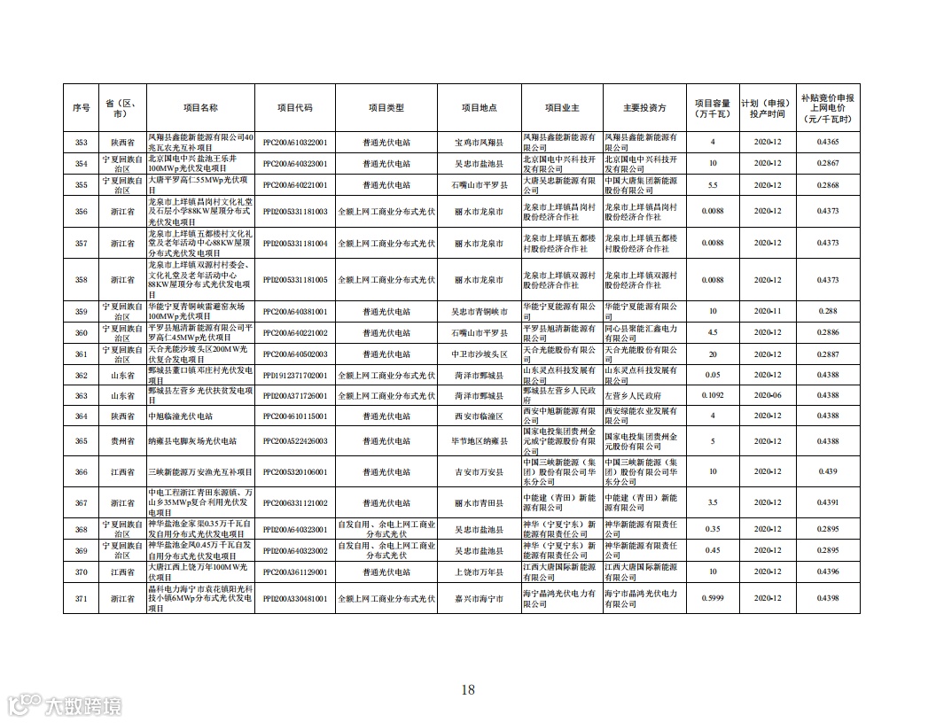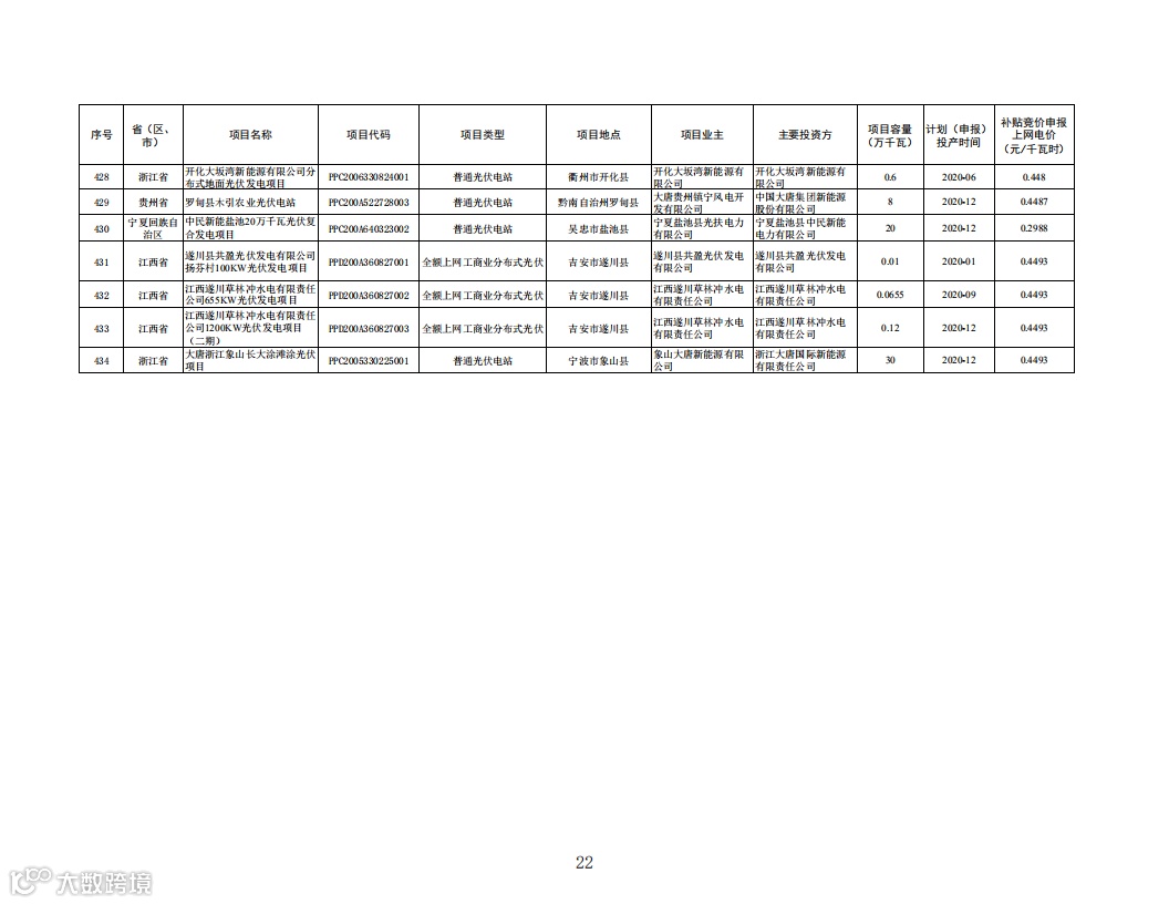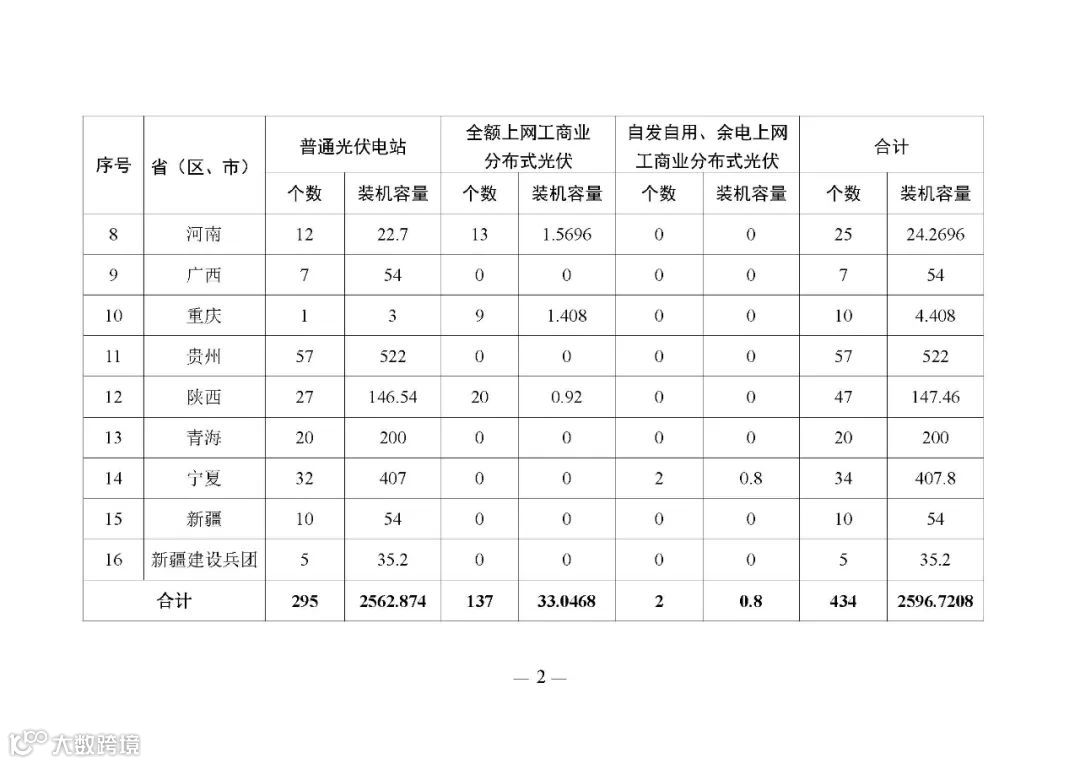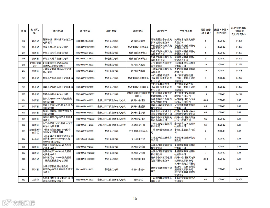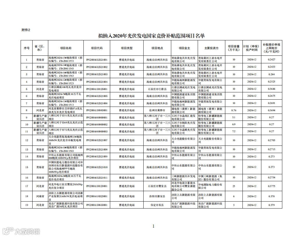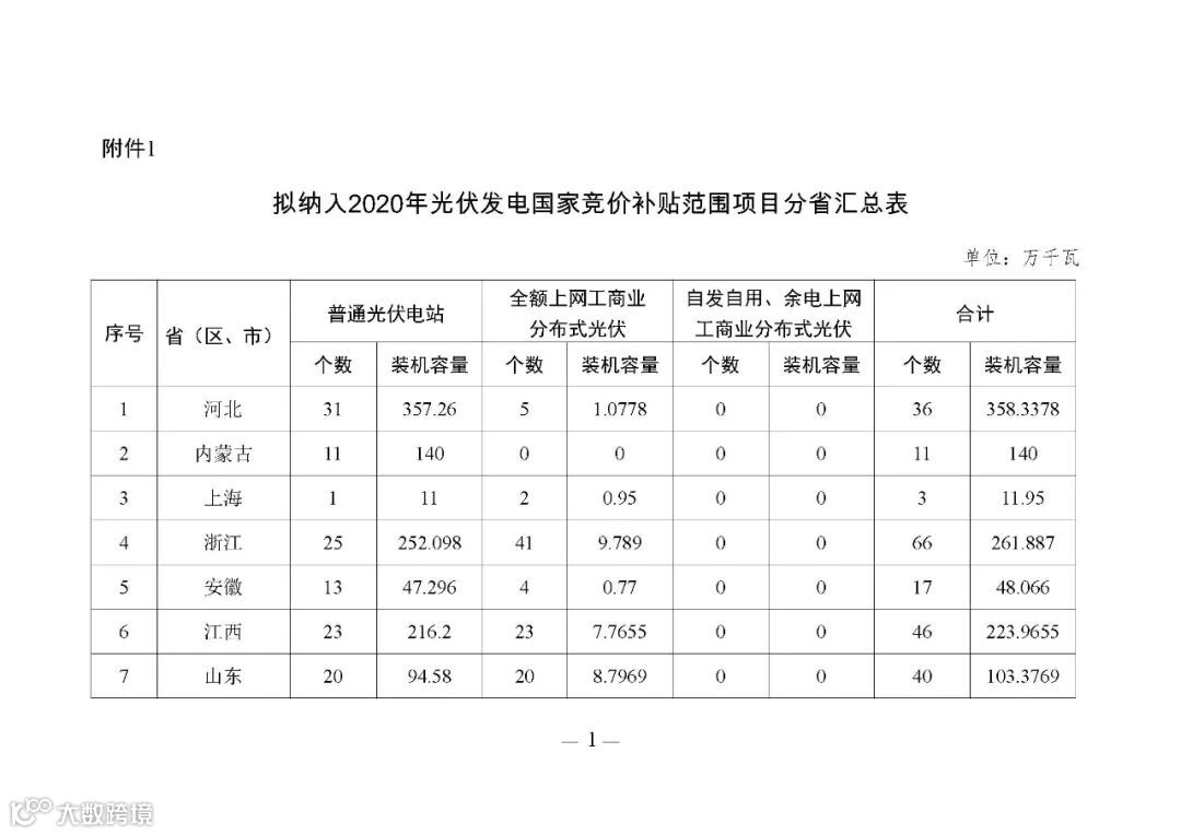 6月28日,国家能源局发布《关于公布2020年光伏发电项目国家补贴竞价结果的通知》,拟将河北、内蒙古等15个省(区、市)和新疆生产建设兵团的434个项目纳入2020年国家竞价补贴范围,总装机容量2596.7208万千瓦,其中普通光伏电站295个、装机容量2562.874万千瓦,工商业分布式光伏发电项目139个、装机容量33.8468万千瓦。