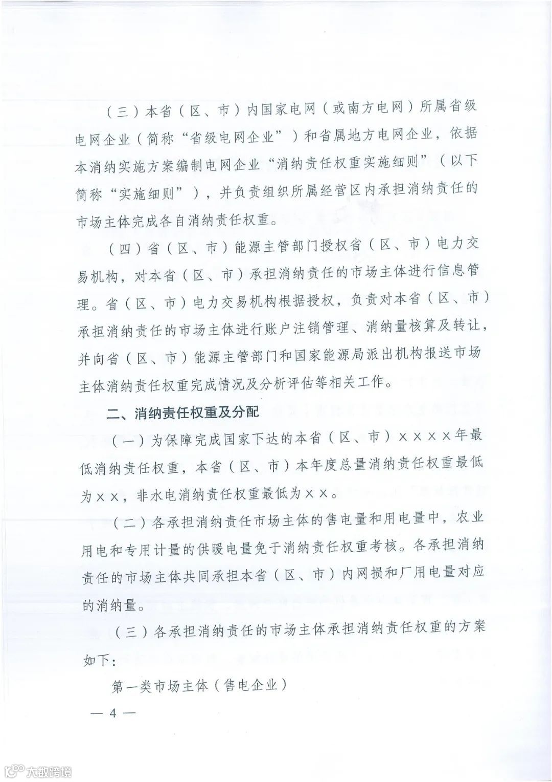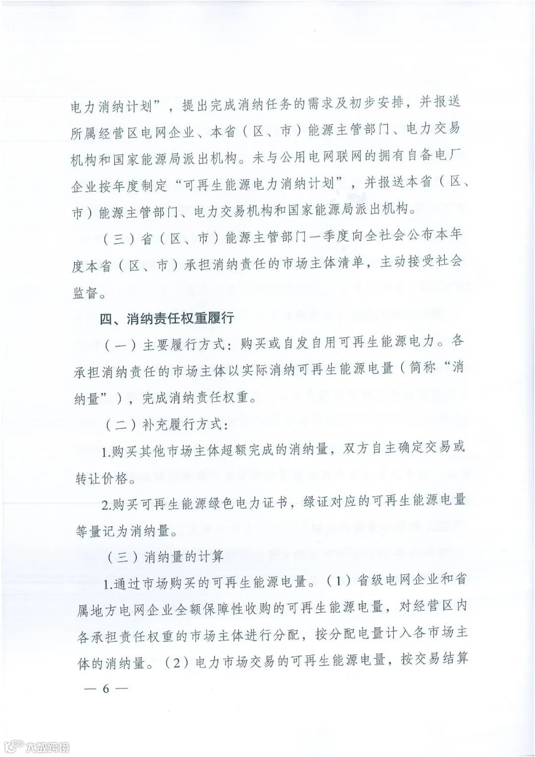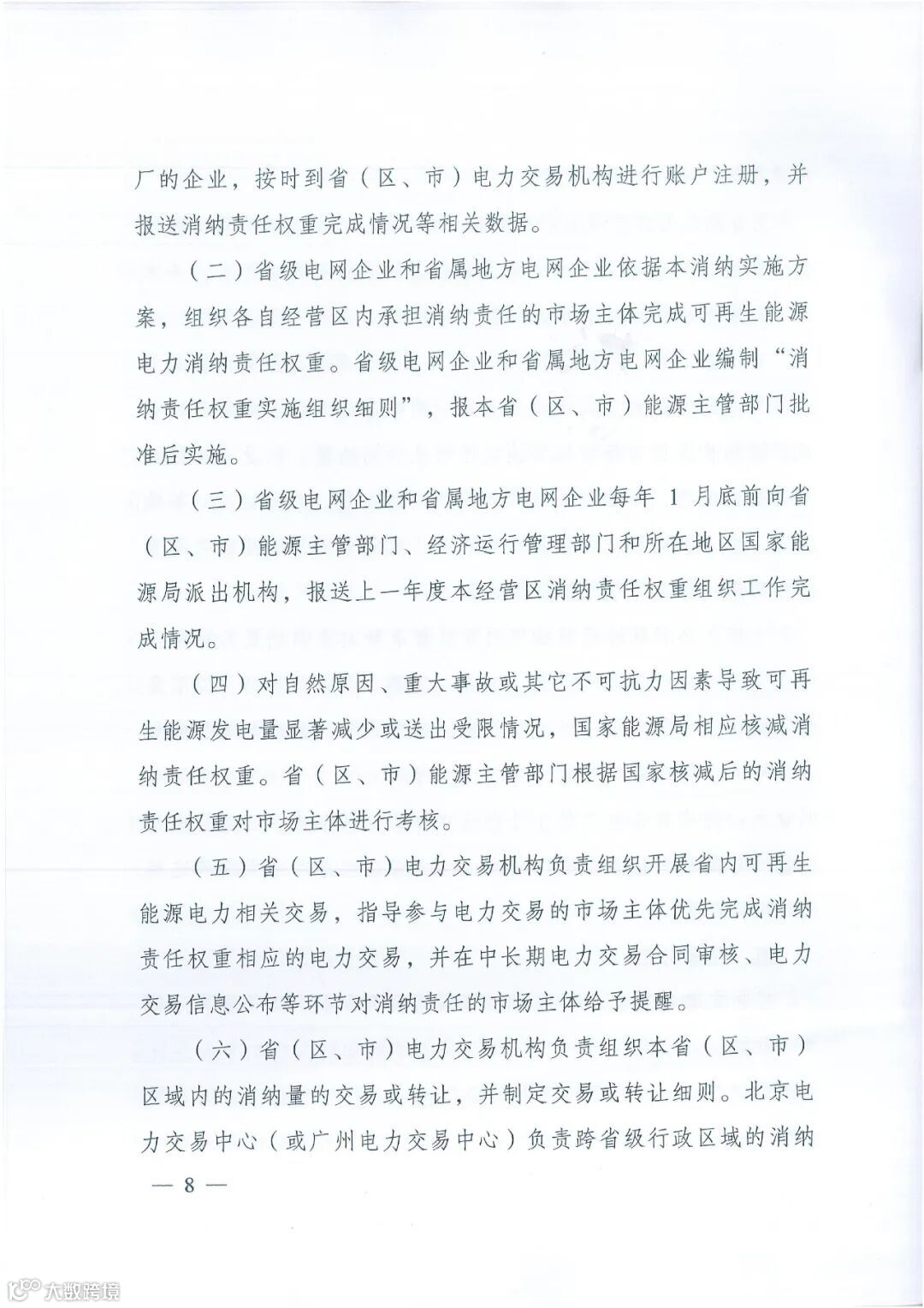 根据大纲,各省要按照国家明确的消纳责任权重,对行政区域内承担消纳责任的各市场主体,明确最低可再生能源电力消纳责任权重,并按责任权重进行考核,对未完成的市场主体进行督促落实,并依法依规予以处理。