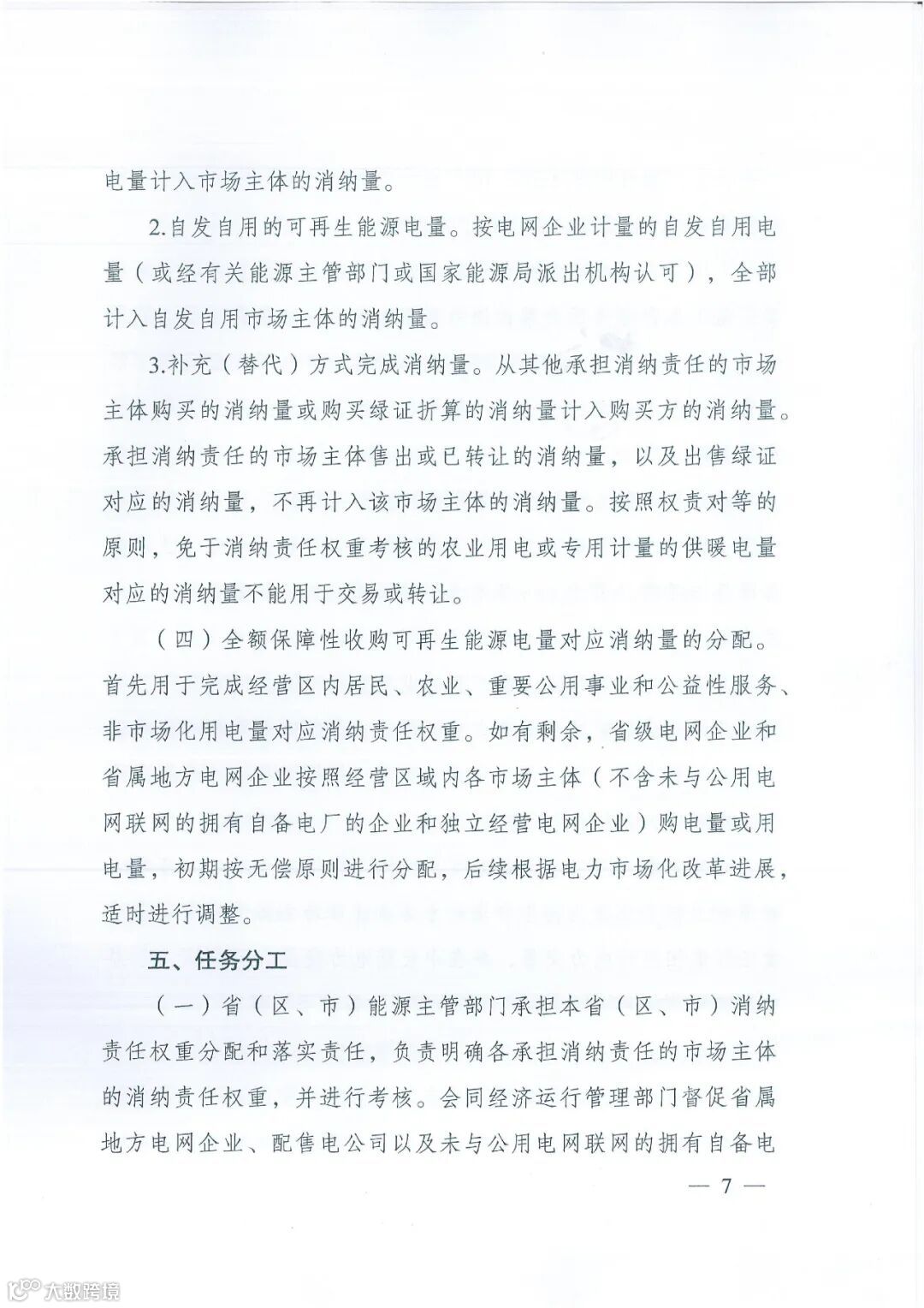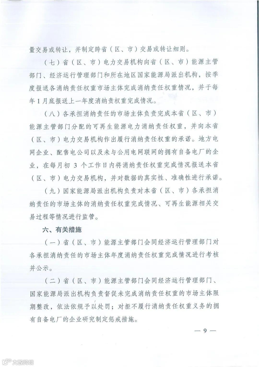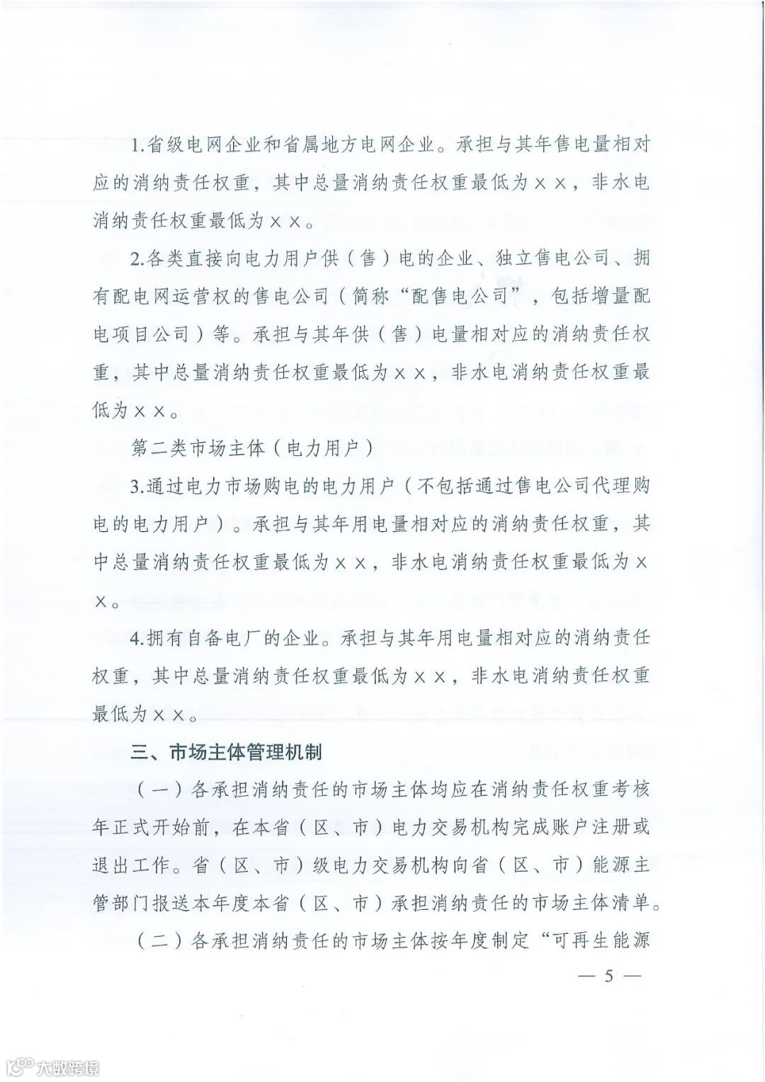 根据大纲,各省要按照国家明确的消纳责任权重,对行政区域内承担消纳责任的各市场主体,明确最低可再生能源电力消纳责任权重,并按责任权重进行考核,对未完成的市场主体进行督促落实,并依法依规予以处理。