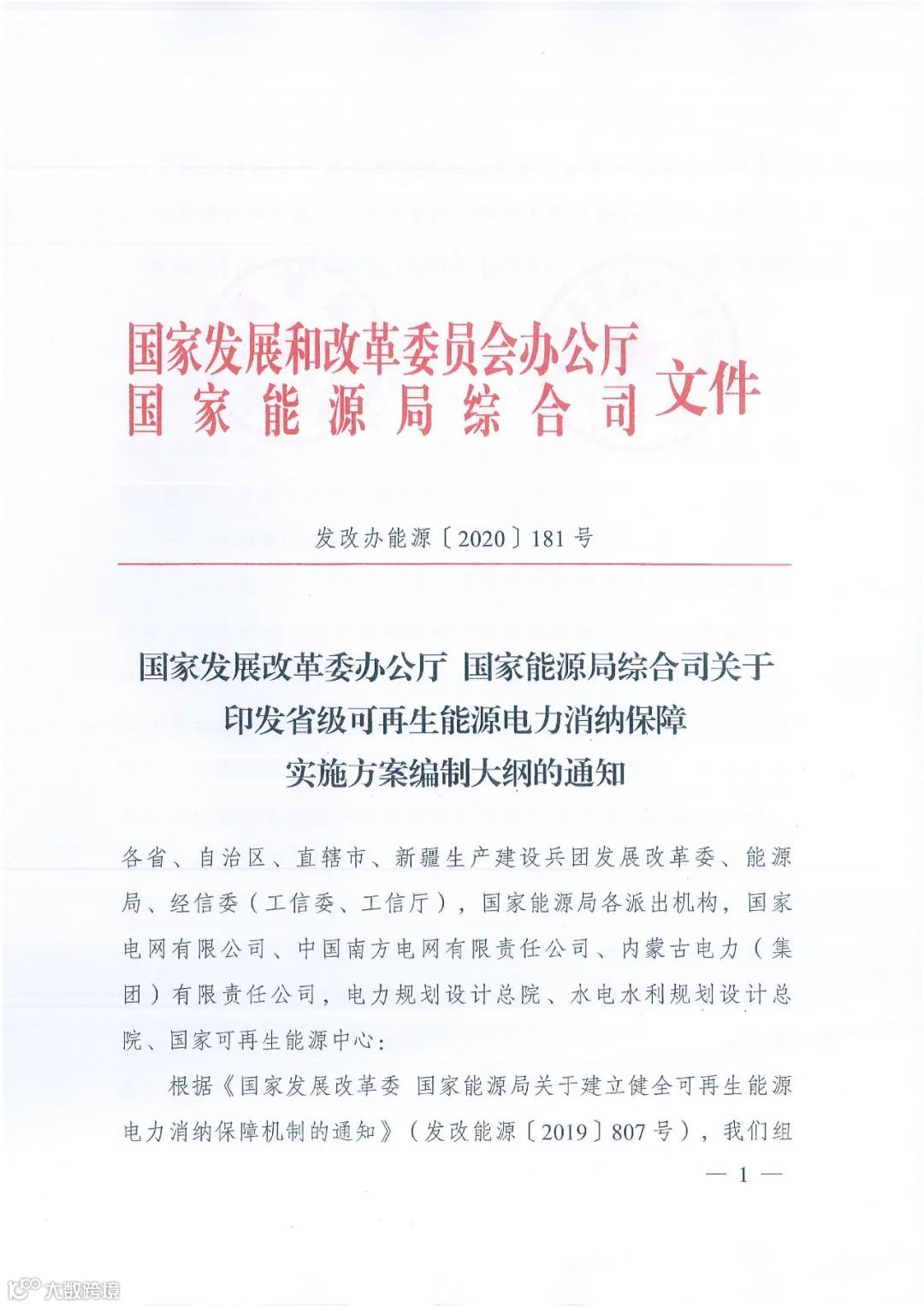 近日,国家发改委办公厅、国家能源局综合司印发《省级可再生能源电力消纳保障实施方案编制大纲的通知》,为省级能源主管部门编制本地区方案提供参考。