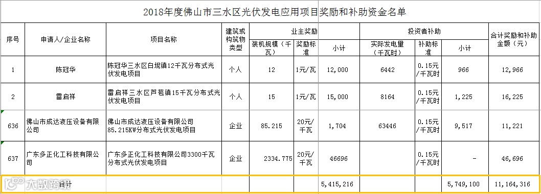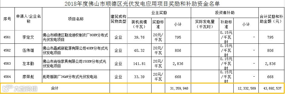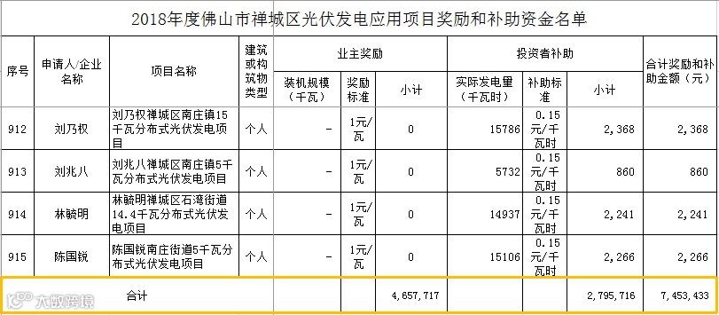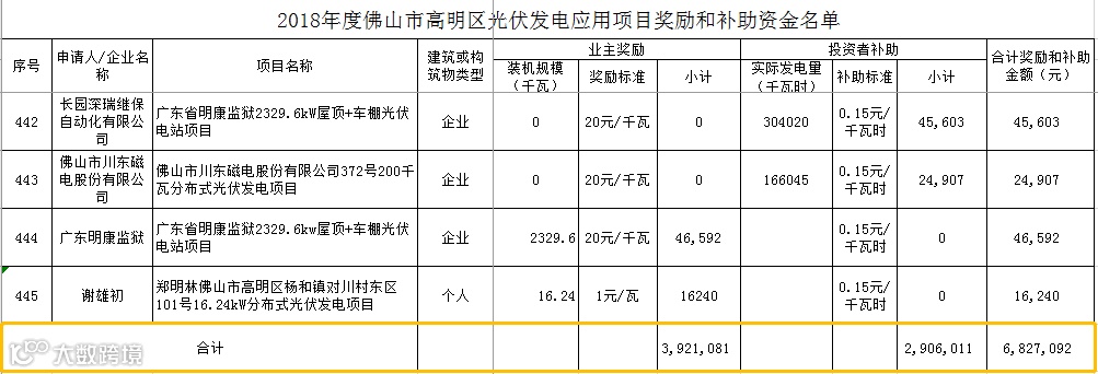 | 项目数量(个) | 装机量(KW) | 发电量(KWh) | 补贴数额(元) | |