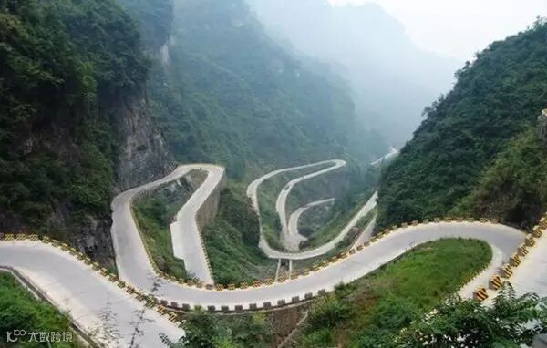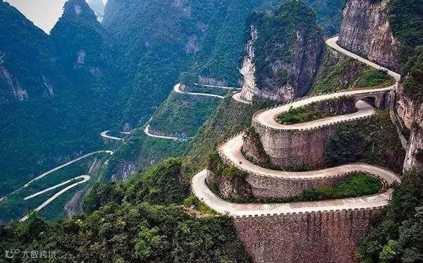 张家界天门山盘山公路有"通天大道"之称,盘山公路全长10.77公里,海拔从200米急剧提升到1300米,大道两侧绝壁千仞,空谷幽深,共计99个弯,180度急弯此消彼长,似玉带环绕,弯弯紧连,层层迭起,被誉为“天下第一公路奇观”。