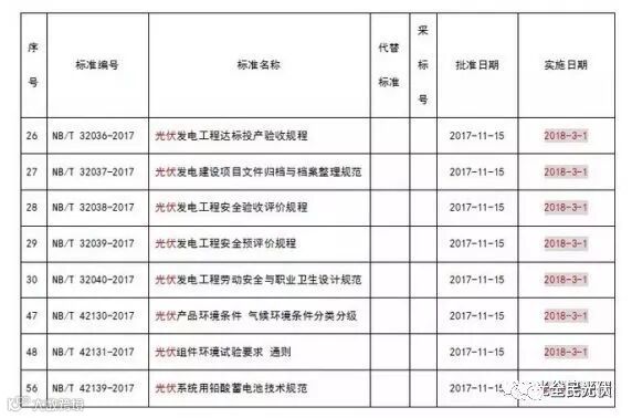 根据国家能源局2017年10号公告,国家能源局批准204项行业标准,实施时间为2018年3月1日,其中包含光伏标准8项。具体详情如下: