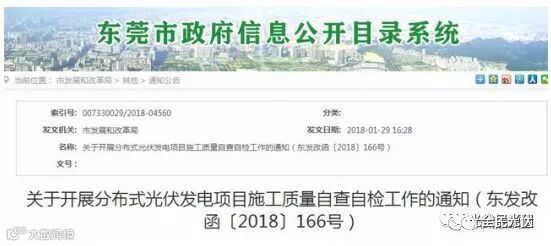 除了积极制定行业标准,政府也会严格审查光伏电站是否符合国家标准——近日,东莞市发改委发文要求相关企业在2-4月份,梳理本企业投资建设的项目清单和情况,对已建成的光伏项目施工质量开展自查自检工作。对各项目的发电效率、防雷接地、电缆走线、材料防火等级和光伏支架结构强度等对照国家标准进行自检自查,并上交保证书。